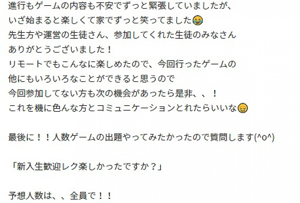 先日「ZOOM」で開催した新入生歓迎レクリエーション、はじめての試みだったので、企画した生徒たちも、ああでもないこうでもないと話し合いながら、準備を進めていきました!