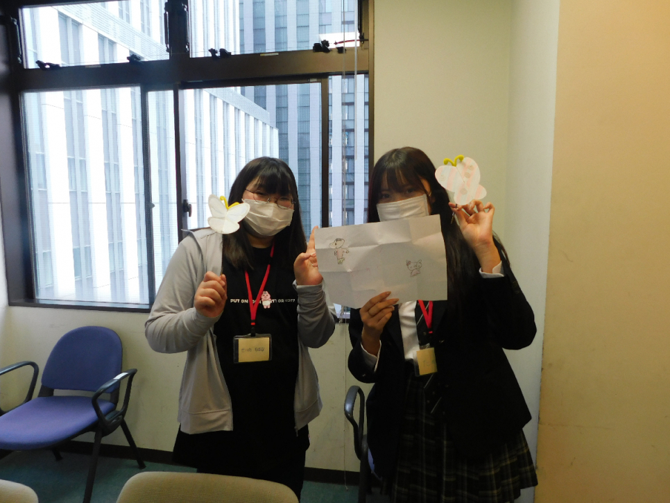 今回は小学生の子どもたちと一緒に「パタパタバタフライ」を作りました。子どもたちは、高校生のお姉さんに笑顔いっぱいでお話しをしていました。