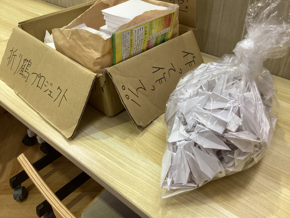 キャンパスでは、終戦80年を迎えたことに何かできないか、と考え広島平和記念館に向けて「千羽鶴」を贈るプロジェクトを始めました。