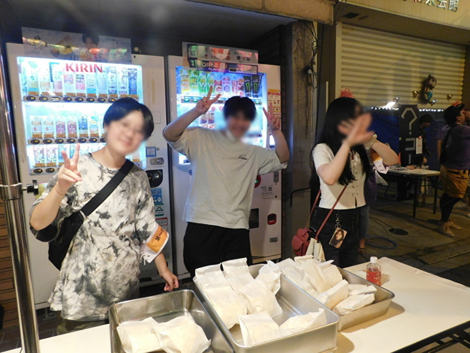 昼頃から準備、夜には本番で各屋台のお手伝い♪ 地域の子どもたちに向けて、やきそば、ポップコーン、金魚すくいなどを販売しました!
