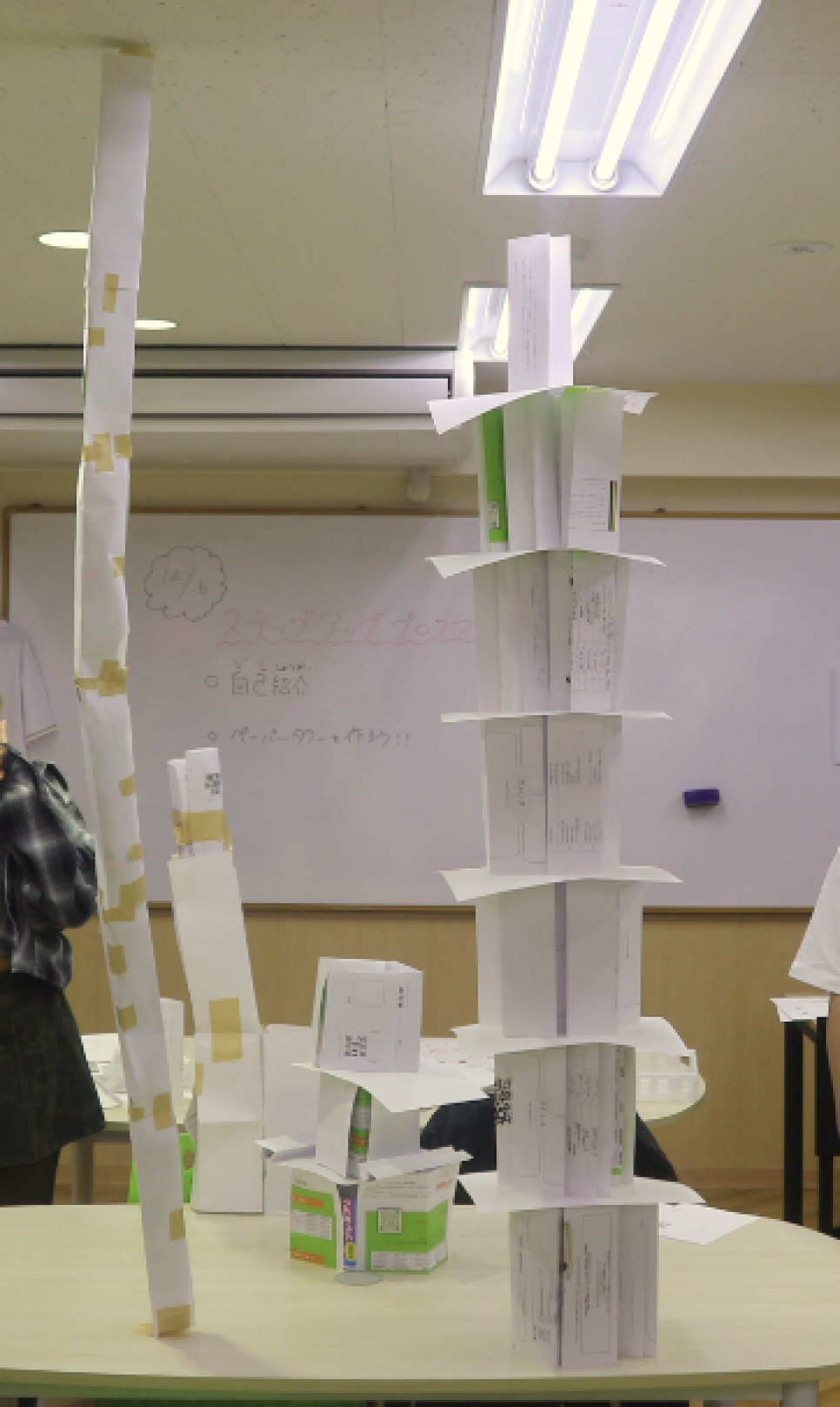 当日は、コミュニケーション講座として「ペーパータワーゲーム」に挑戦しました。グループごとに作戦を話し合い、限られた紙だけを使ってどれだけ高く積み上げられるかを競う活動です。
