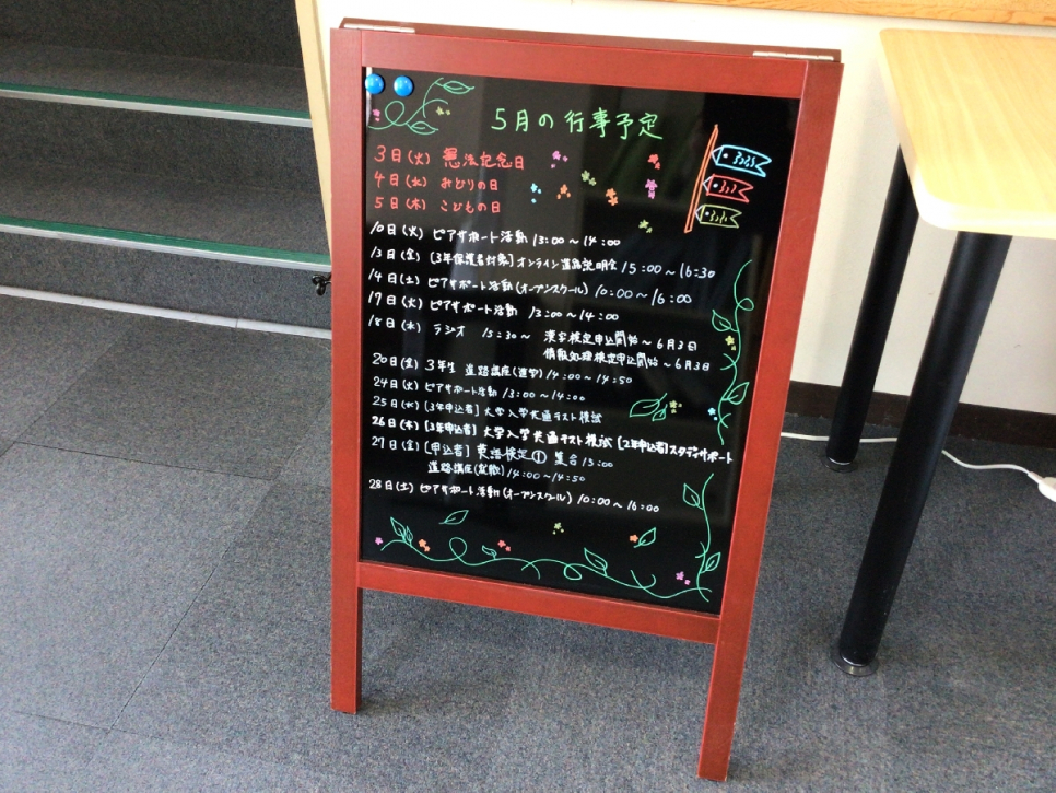校舎の環境整備の一環として、1階の入り口前には月予定のブラックボードでお出迎え、2階に上がったところにはポップな雰囲気で明るい感じのお出迎え用にリニューアルされましたヽ(^o^)丿