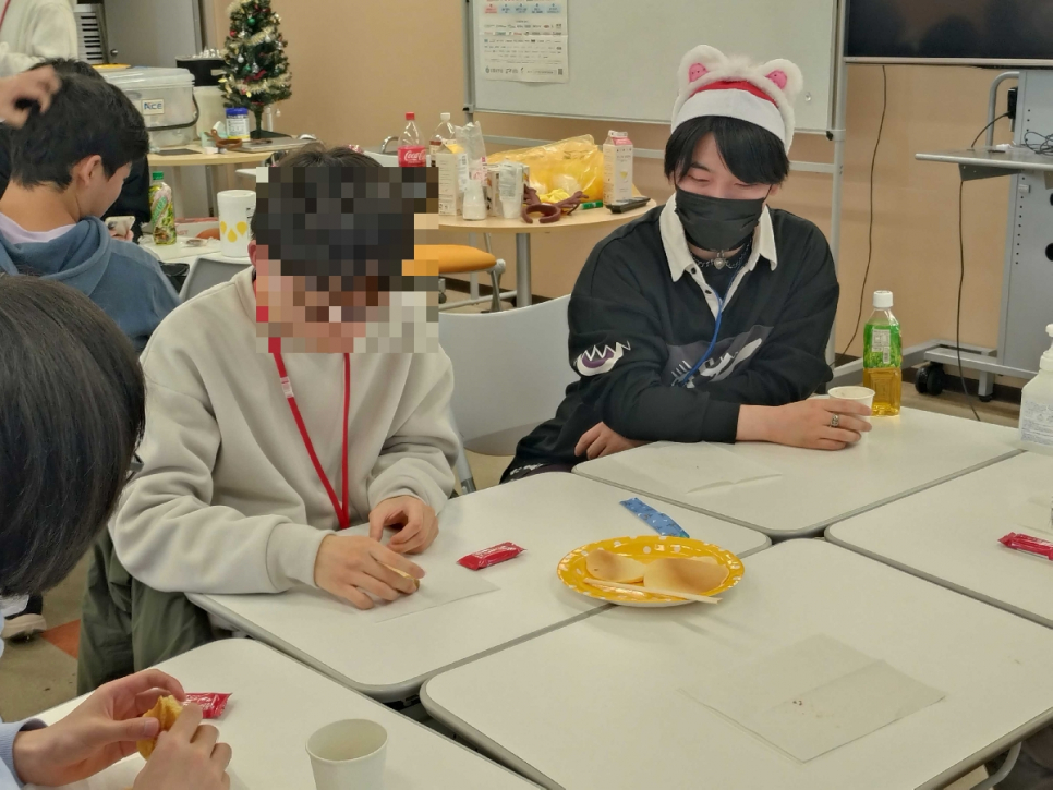 会場では入口のメインツリーとは別のミニツリーを飾り、コスプレやサンタの帽子をかぶってクリスマスの雰囲気満載の中、中学生や転入生を招待して交流を広げることができました。