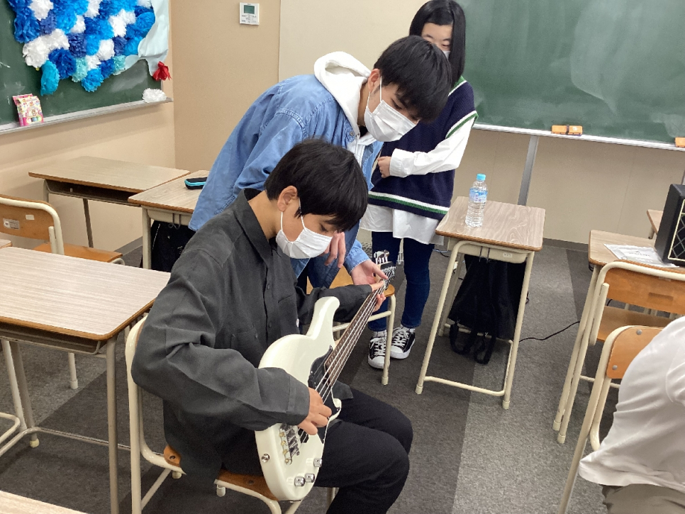 バンドサークルでは、実際にギターやベース、ドラムなどを触って練習しました。