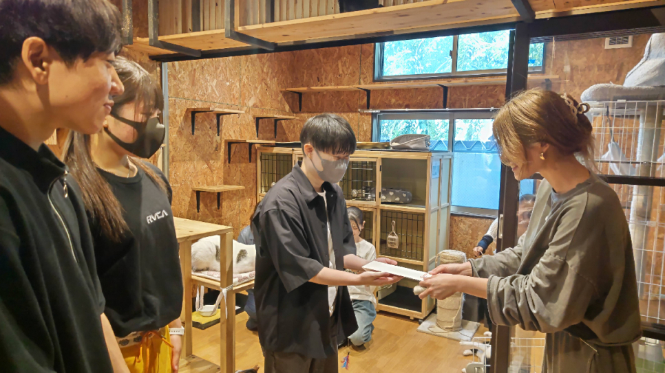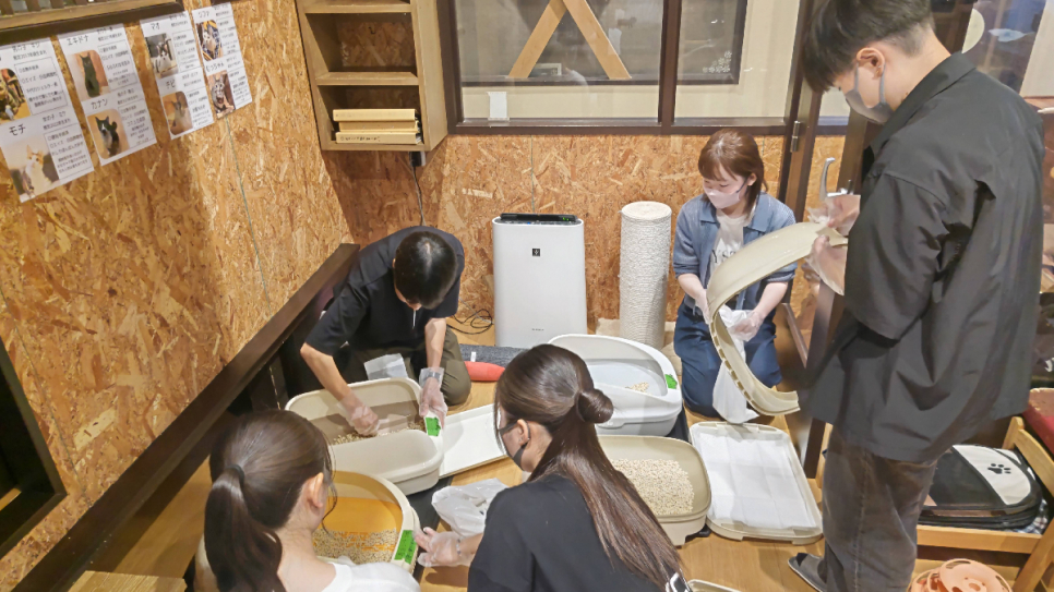 保護猫活動では、月に2,3回保護猫カフェに行き、トイレ掃除やソファの毛をとったり、