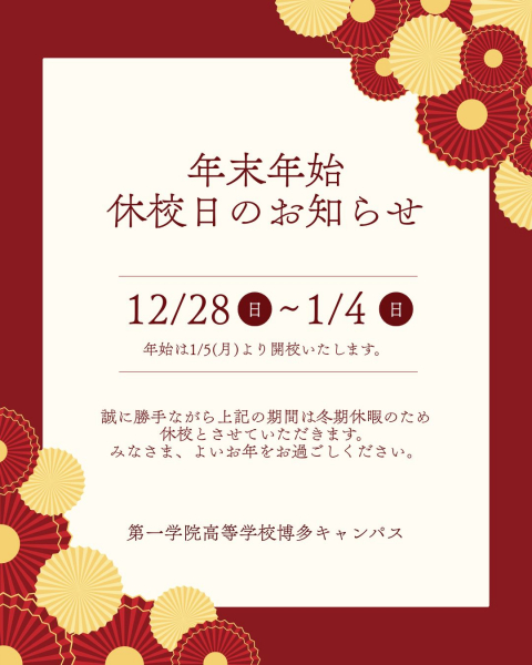第一学院☆博多キャンパス~【休校のお知らせ】年末年始~!こんにちは! 第一学院高等学校博多キャンパスです♪ 今年度も本校の教育活動にご理解とご協力を賜り、 誠にありがとうございました。 さて、年末年始は冬期休暇のため、 2025年12月28日(日)~2026年1月4日(日) の期間、休校とさせていただ... -
