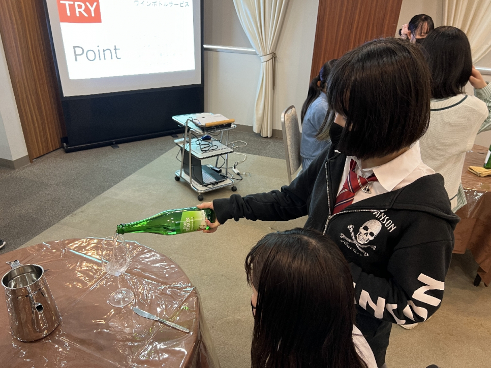 体験授業では、マナーから教えていただき、テーブルクロスやワインの注ぎ方も教えていただくことができました。