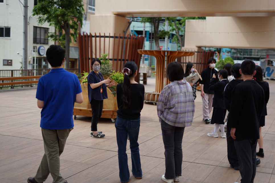 井町先生が新川モールの説明をしています!新川モールにある多くの植物の水やりをゼミ生が分担して行っています!