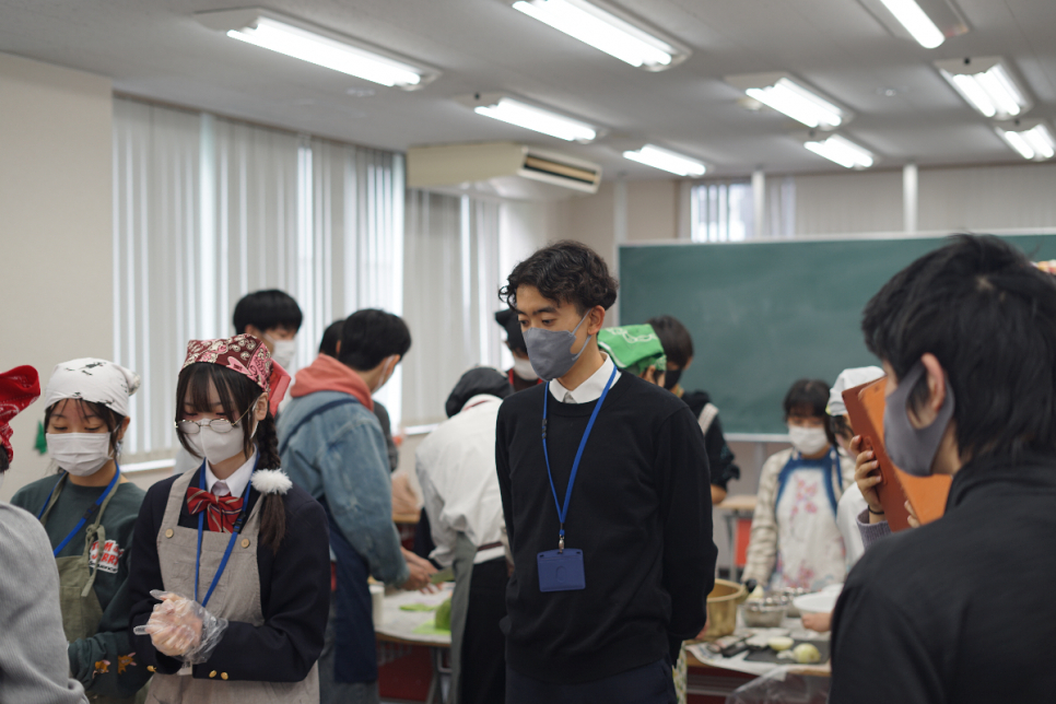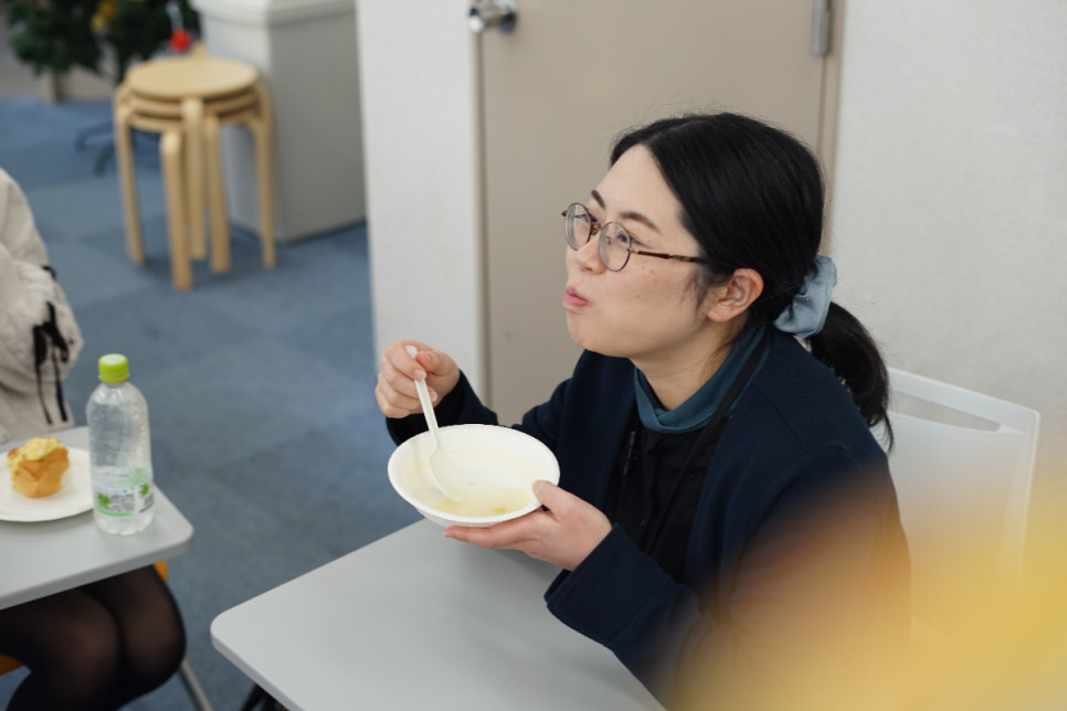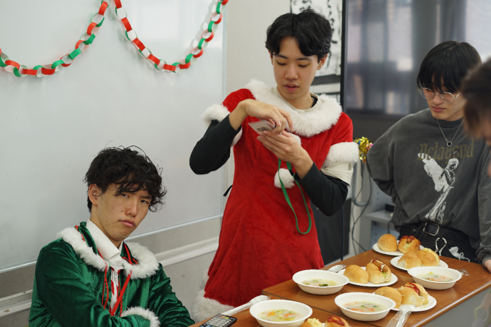 今年のクリスマスレクリエーションでは、参加した生徒と一緒にクッキングを行い、シチュー作りと総菜パン作りに挑戦しました。役割分担をしながら協力して調理を進め、完成した料理を囲む時間は、自然と笑顔があふれるひとときとなりました。