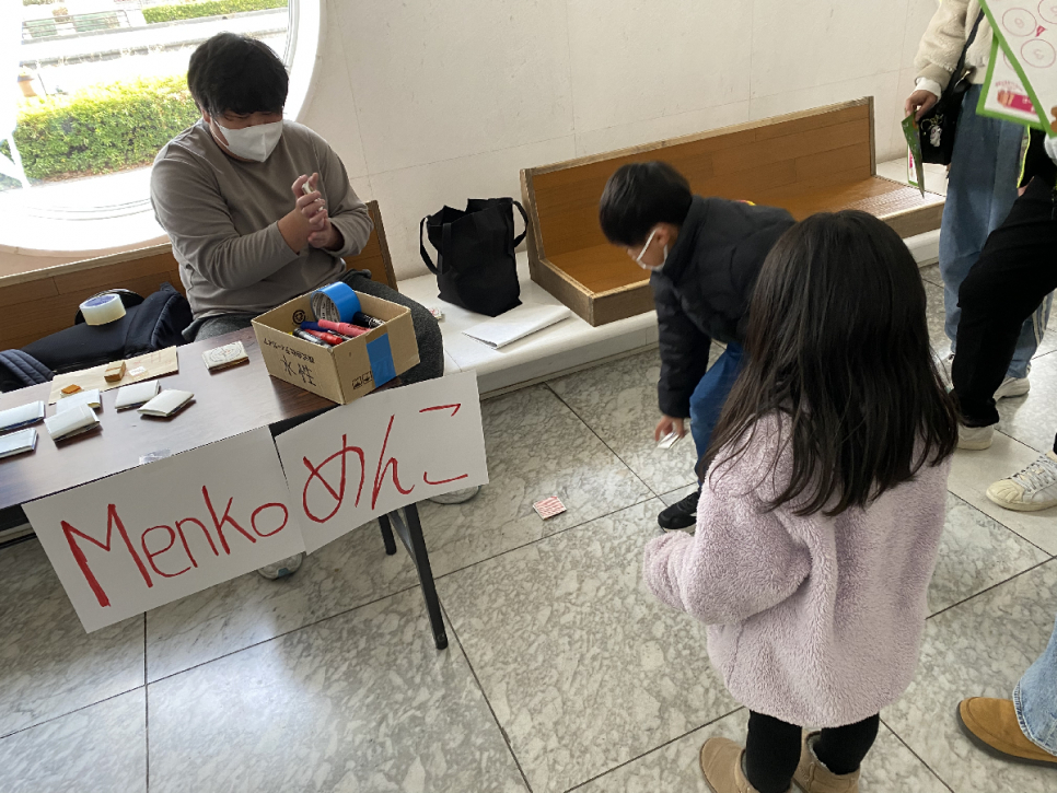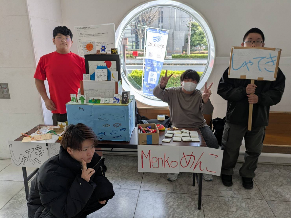 世界平和ゼミでは、「日本文化を外国の方に伝えたい」という思いから、射的やめんこといった日本の昔ながらの遊びを、生徒たちが工夫して準備しました。
