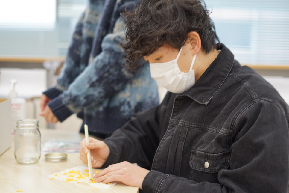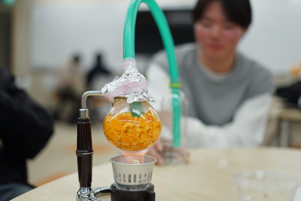 現在は、ミカンのオイルを抽出するための実験に挑戦中です。