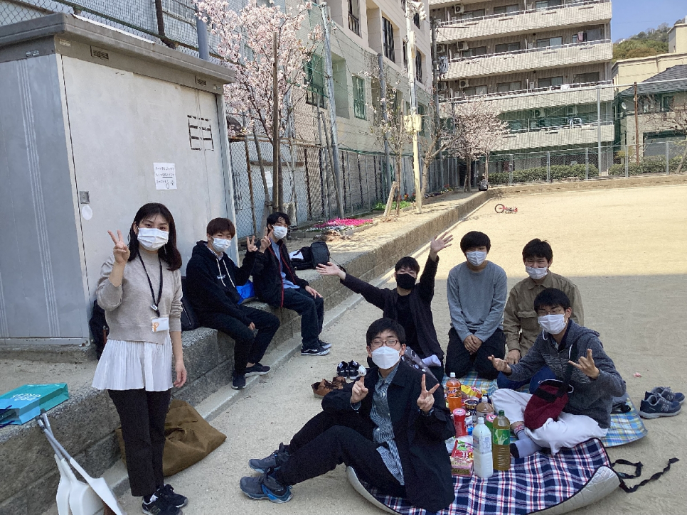 先日ボランティアで清掃した公園に行き、桜を見ながらみんなで話したり、お菓子を食べたり、少し運動したりと花見を楽しみました。