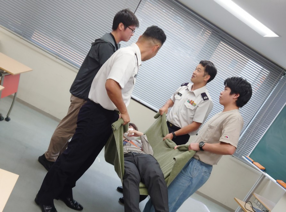 いざという時に、毛布を使い人を運ぶタンカーも体験( ゚Д゚)