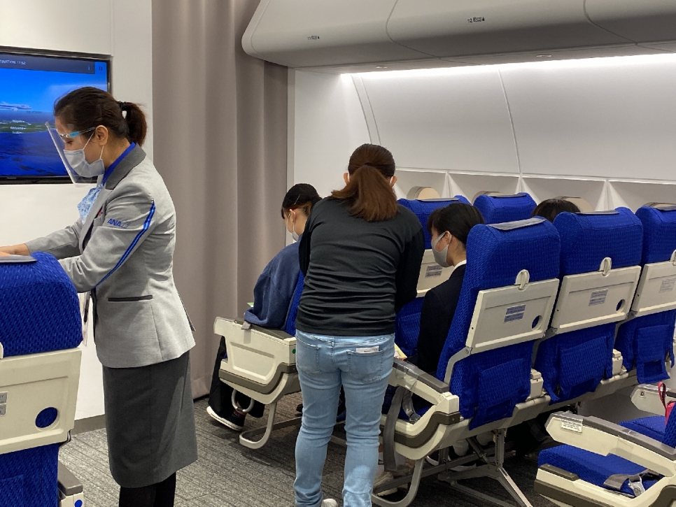 英語力別のグループに分れ、カフェでの注文の仕方や飛行機の機内での会話など
