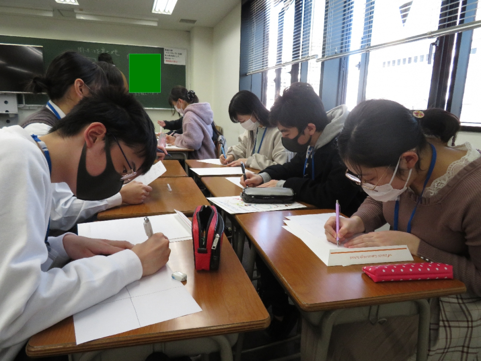 好きなものをシートに書き、「他己紹介」として題し、お隣の人を紹介していくというもの。発表し終わったら皆で拍手!初対面ながら、温かい雰囲気でグループワークに取り組みました。頼もしい高校生のピアサポーターが、優しく、楽しく盛り上げていました!
