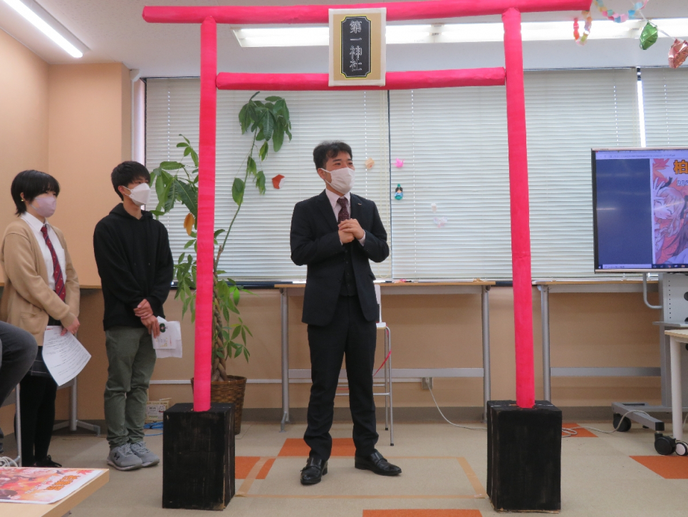 オープニングは鳥居の下で司会者の二人と校長先生の挨拶!