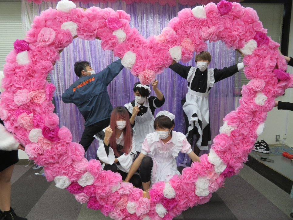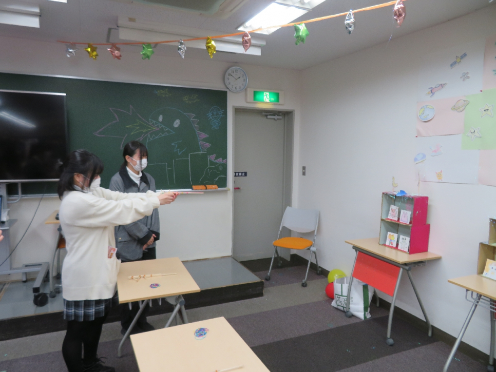 2年生は、玉入れやピンポン玉をスプーンで運ぶ懐かしの遊びができる「懐玉亭」、可愛いハートのオブジェやメイドさんと一緒に写真が撮れる「フォトスポット」、宇宙怪獣の的を倒して景品をゲットする「射的banban」