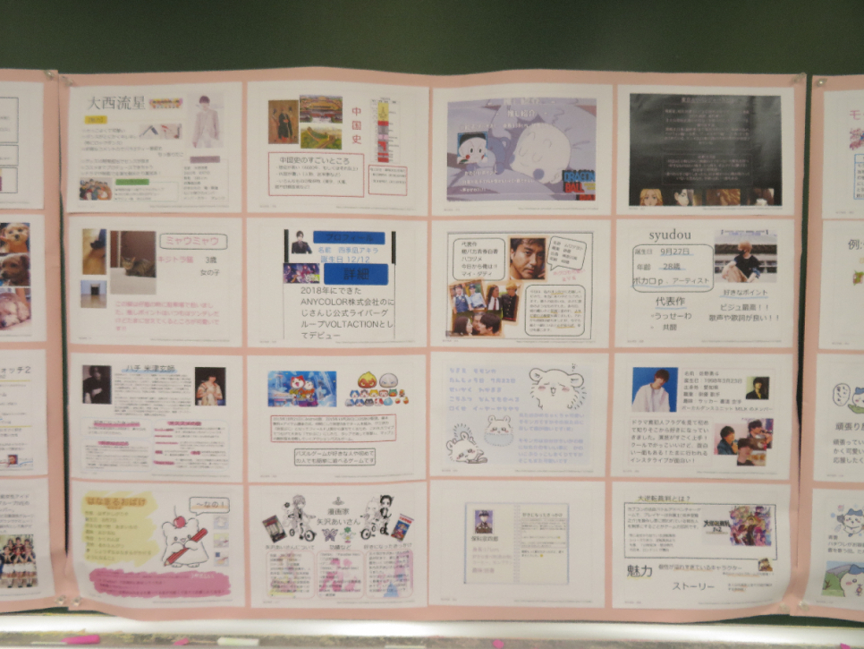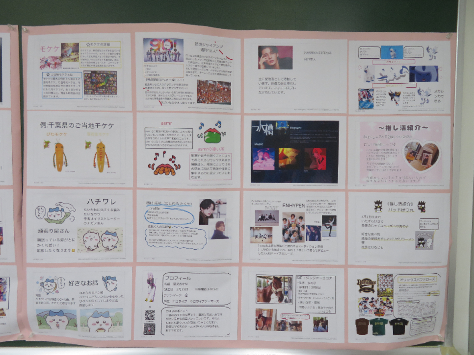 生徒一人一人が取り上げた「推し」は十人十色で、自分の好きなキャラ、漫画、ゲーム、アイドル、野球チーム、ペット、文豪、歌手などジャンルが多く、非常に見応えあるものばかりでした!