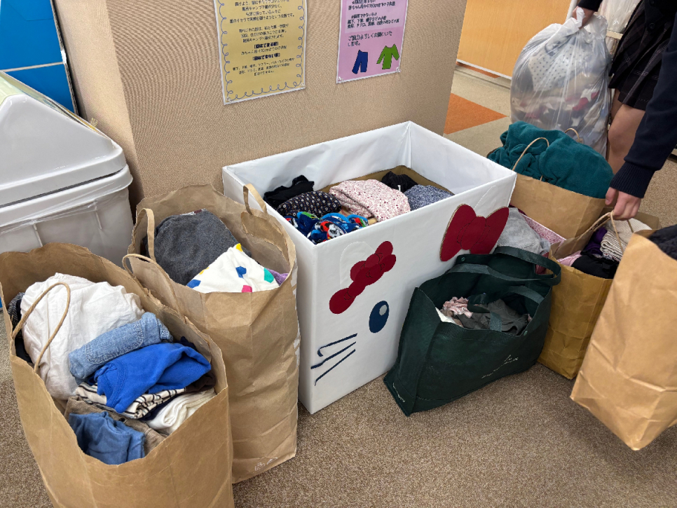 柏キャンパスでは、近隣の幼稚園や保育園に古着回収ボックスを設置して、子ども服を難民キャンプの子どもたちへ届ける活動をしています。