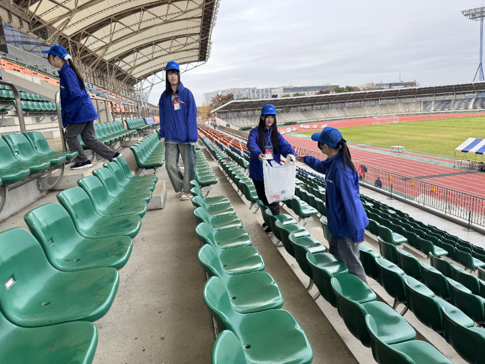 大きな会場でボランティア活動に参加した生徒たち。