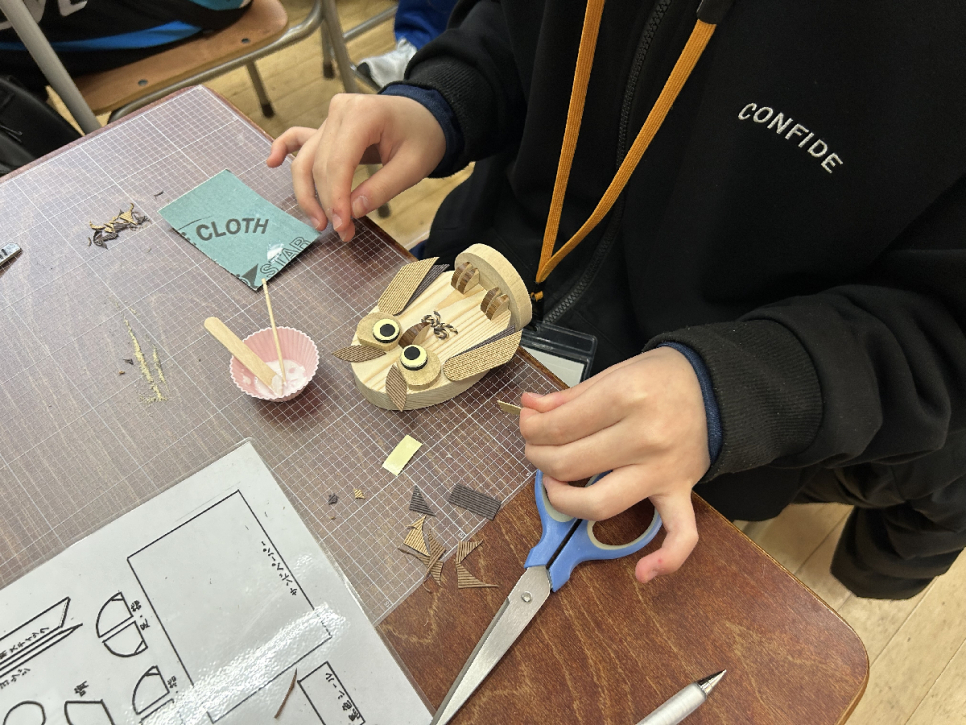 集中してヤスリで木を削る真剣な姿や、バランスを何度も確認しながら慎重にパーツを貼る姿が見られました。