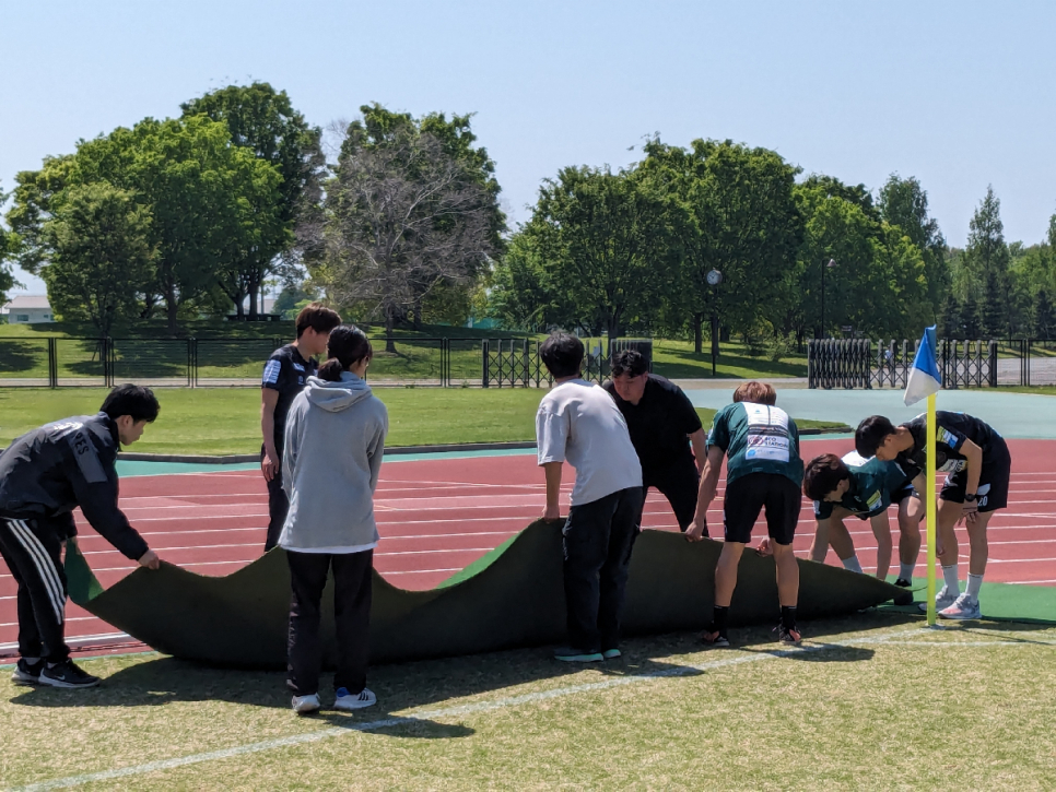 #選手と一緒に人口芝設置