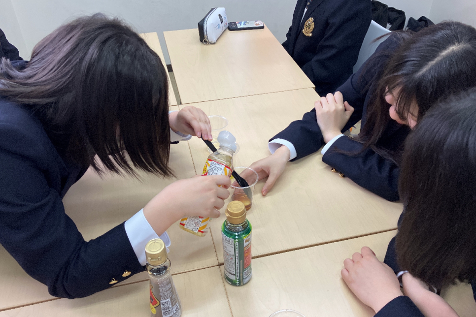今回の実験は“比重の層”の観察!サラダ油、ごま油、オリーブオイルなど、いろんな油を混ぜると層になるのですΣ(‘Д’) その後の解説授業では、層になる理由から原子と分子の構造まで、化学の知識を得ることができました.。oO