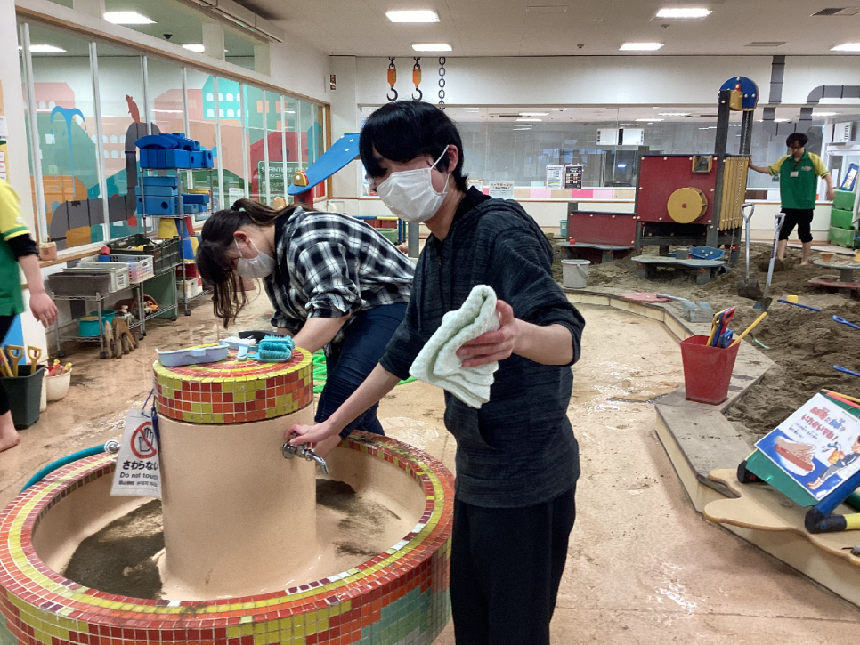 施設内の遊具や床の掃除、砂場などを綺麗にしています!