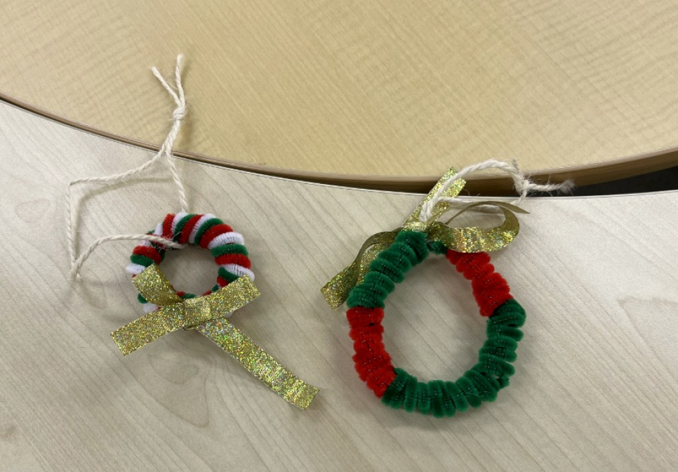 モールを使って手作りリースやチョコペンなどを用いて市販のお菓子をクリスマス風にデコレーション♪