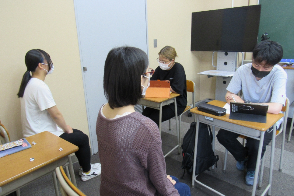 面接官と受験者を役割分担して、生徒同士で模擬面接の練習も行いました。