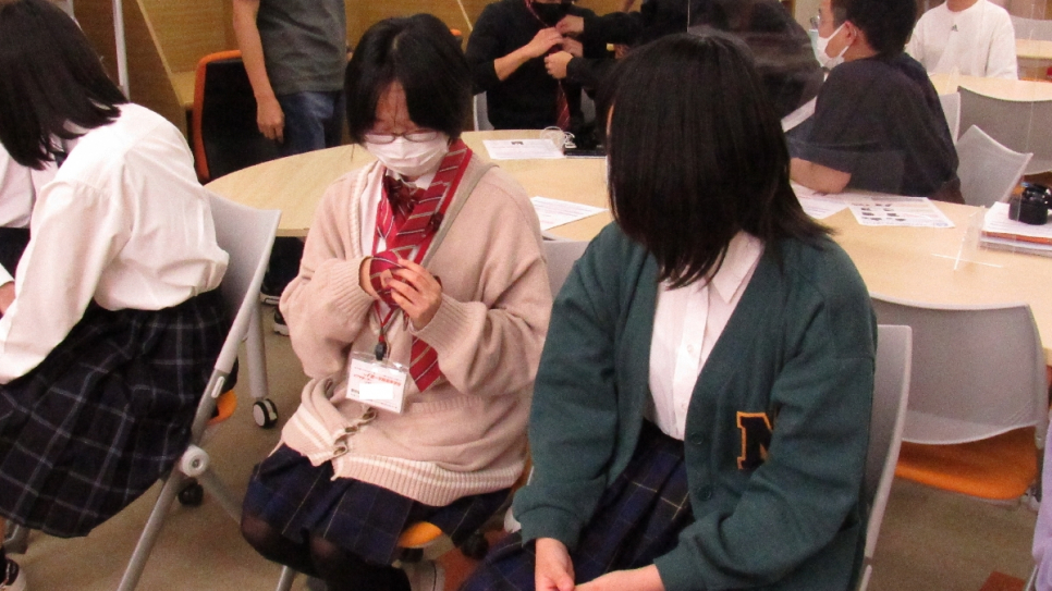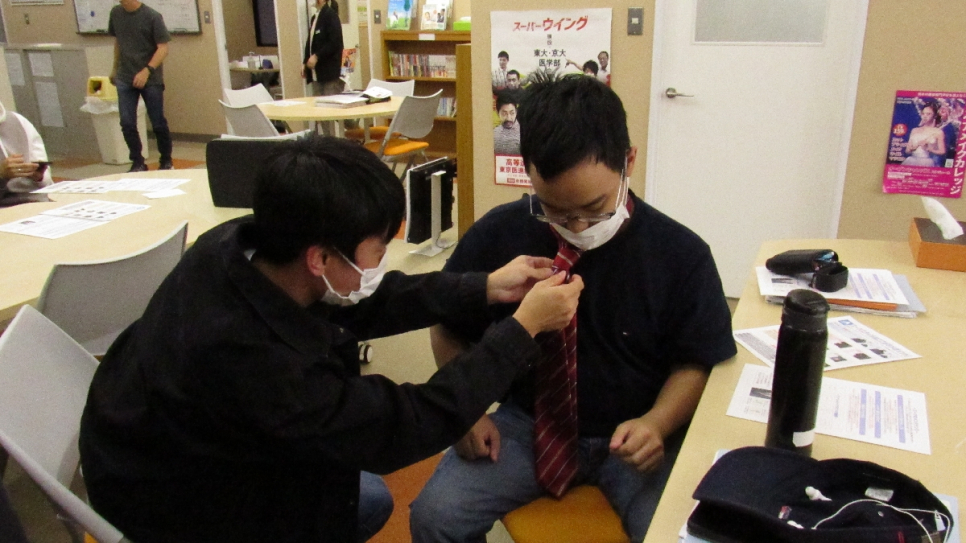 自分でできない生徒は友達と結び合い、結び方を学んでいました。