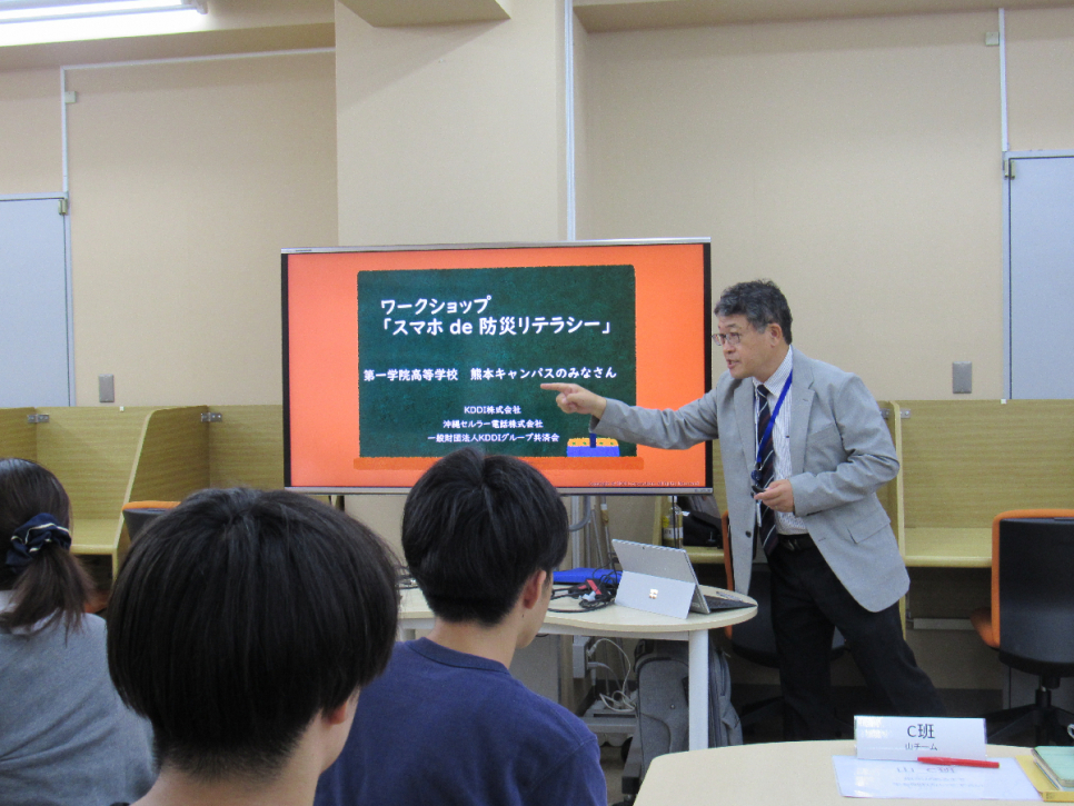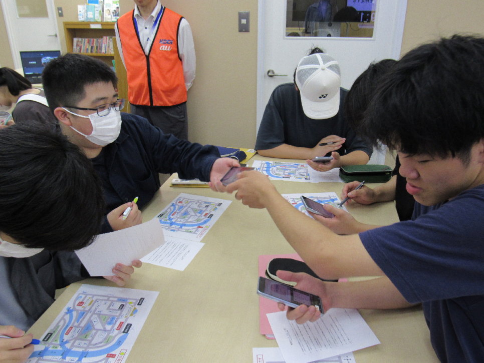 今回の授業はこのテーマのもと、スマホで連絡を取り合い、安全な場所に避難する経路を探す授業を携帯電話などの通信を取り扱う企業さまに行っていただきました。