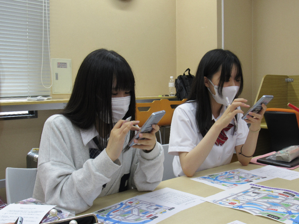 各グループに家族の一員がいます。持っている情報もバラバラの中、スマホのチャット機能を使い、情報を発信し合いました。最後に、みんなで集めた情報から安全な避難経路を各グループで決定しました!!安全な経路を選べているグループもありましたが、情報が足りず、安全な経路を見つけられていないグループも多かったです。