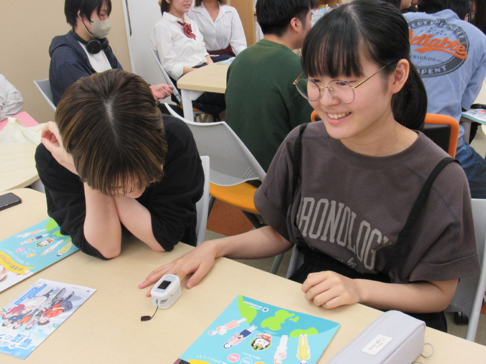 こんにちは!第一学院高等学校熊本キャンパスです(^^♪ 先日、看護師の方にお越しいただき、看護師体験を行いました。酸素濃度を測ったり、脈拍を測ったり、聴診器で友達の心音を聴いたりしました!普段の脈拍がどれくらいかを知ることで緊張したことが把握でき、呼吸法に生かすことができることも教えていただいました。看護の学習をすることで自分の健康にも生かしていけることを知りました♪