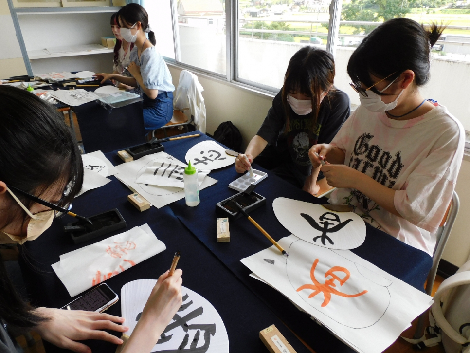 体験授業「書のうちわアート」。個性的な作品が出来上がりました!