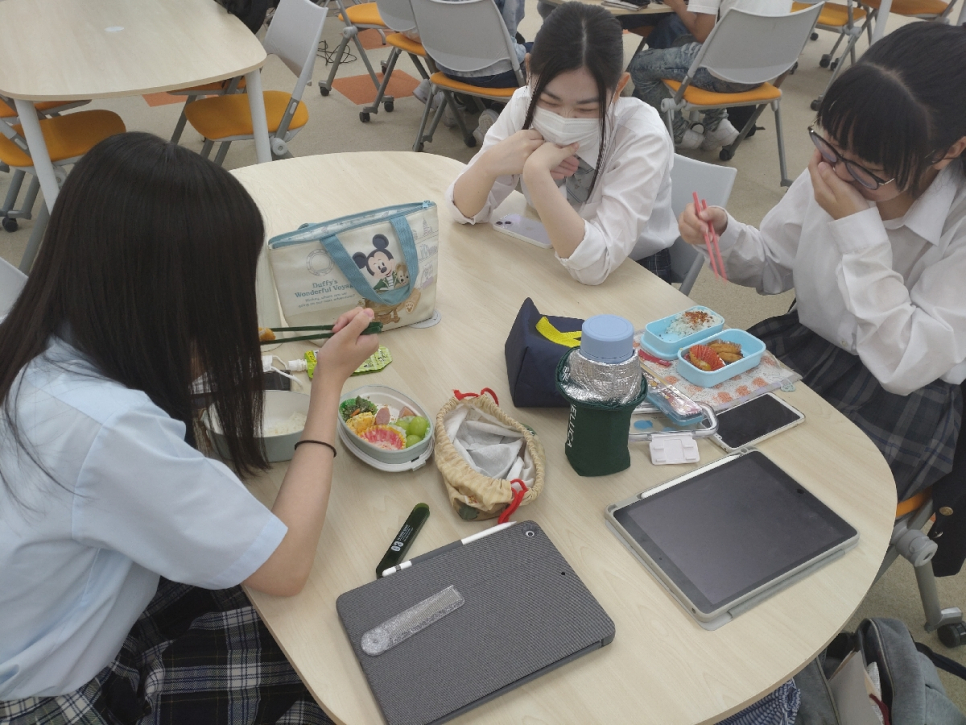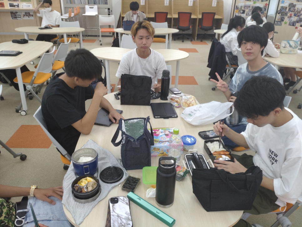 教室で一人ゆっくり食べる人、フリースペースでみんなと一緒に食べる人・・・昼休みの間に飲食店に食べに行き、授業までに戻ってくる生徒もいますよ(*^^*)