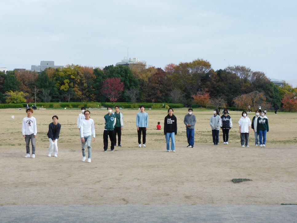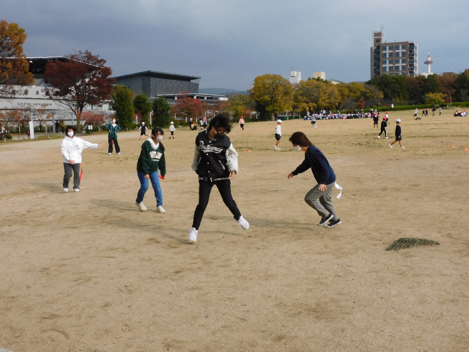 寒さに負けず、みんなで体を動かして楽しもう!ということで、梅小路公園の芝生広場で鬼ごっこをしました。