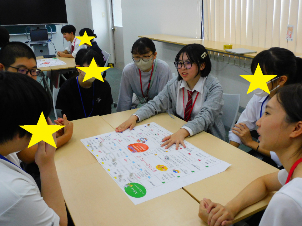 保護者の方に入試制度の説明を聞いていただいている間、生徒は在校生と一緒にコミュニケーションワークに取り組みます。スゴロクトーキングの様子です。