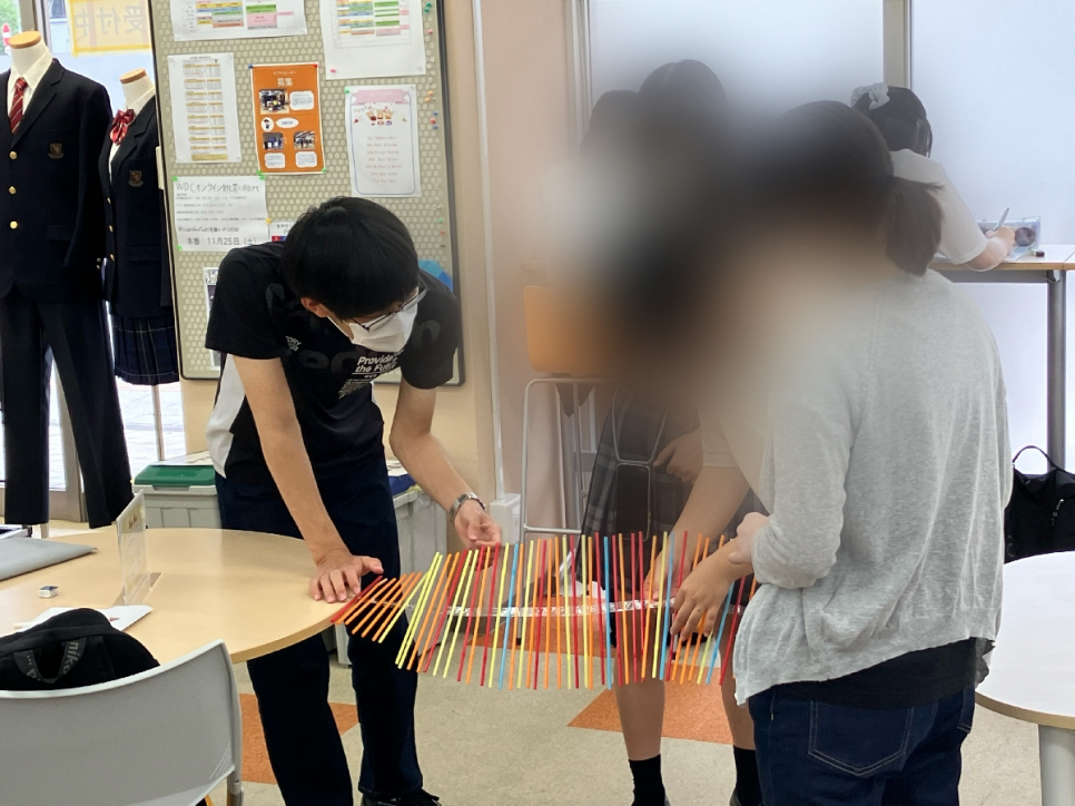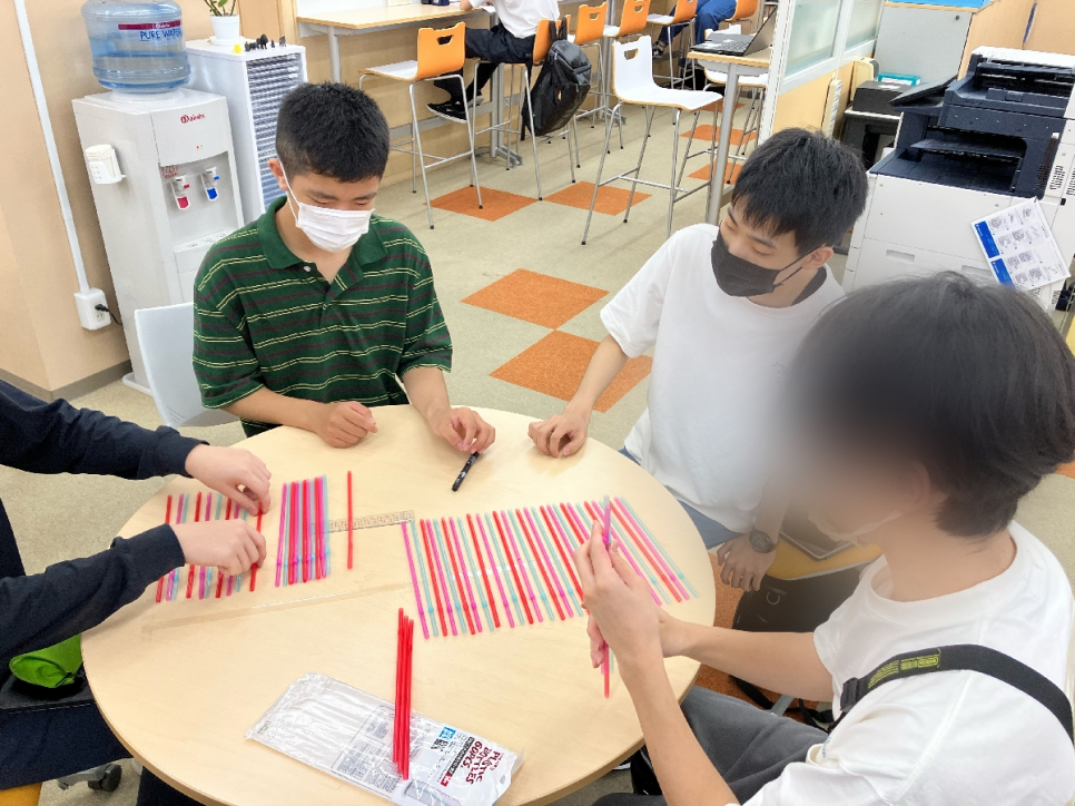 波の性質を調べるための装置を、ストローで再現することができました★ ストローの長さや間隔など、いろいろと考えながら作業をしないといけませんが、みんなで協力して上手に作りました♪ 授業後半では、振幅や周期などの用語を確認しつつ、波の性質について学びました(*^^*)