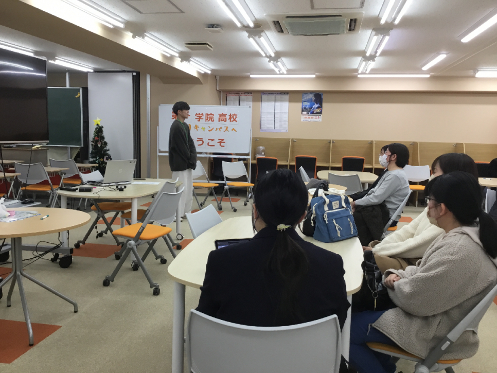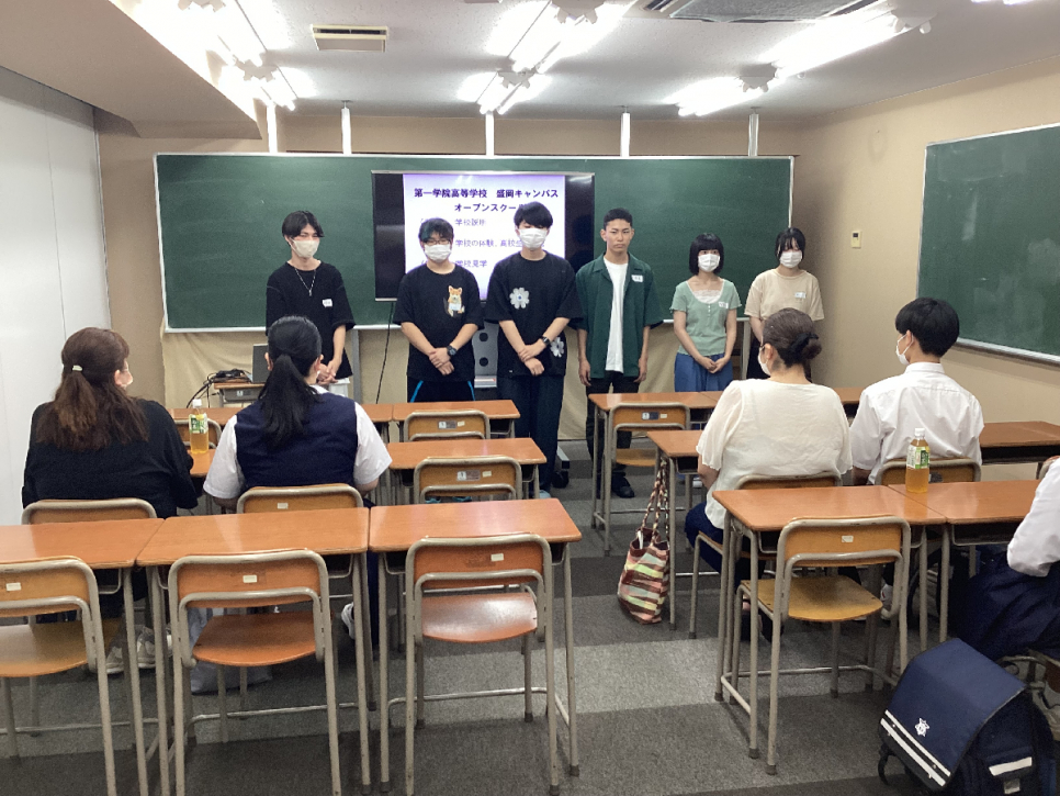 私たち、盛岡キャンパスでは、オープンスクールの前にピアサポだけでどのように進めていくかを話し合い、オープンスクール当日は中学生1人1人に合わせて話をして、どうやったら楽しんでもらえるかを常に考えて行動しています。オープンスクールの後は必ず反省会をし、中学生1人1人どのような人だったのかを話し合い、入学した後ももっと楽しく過ごせるように話し合いを行なっています。
