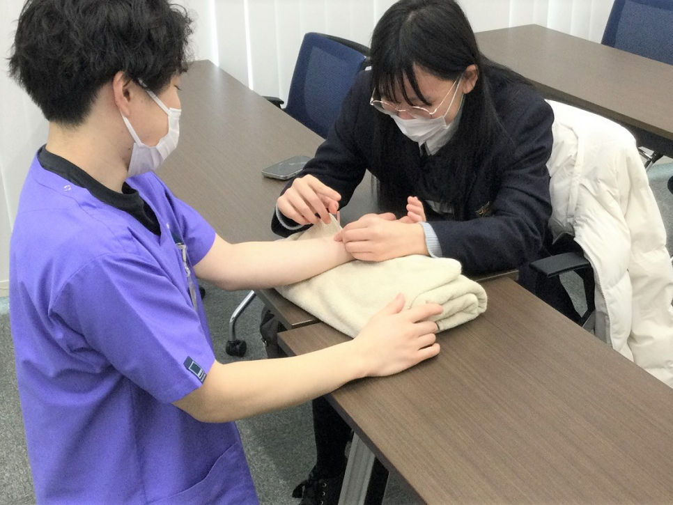先生に針を打ってみました(^^♪(盛岡医療大学校)