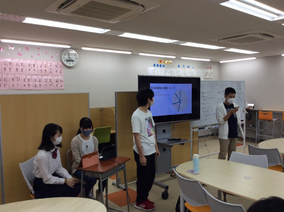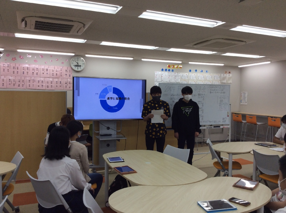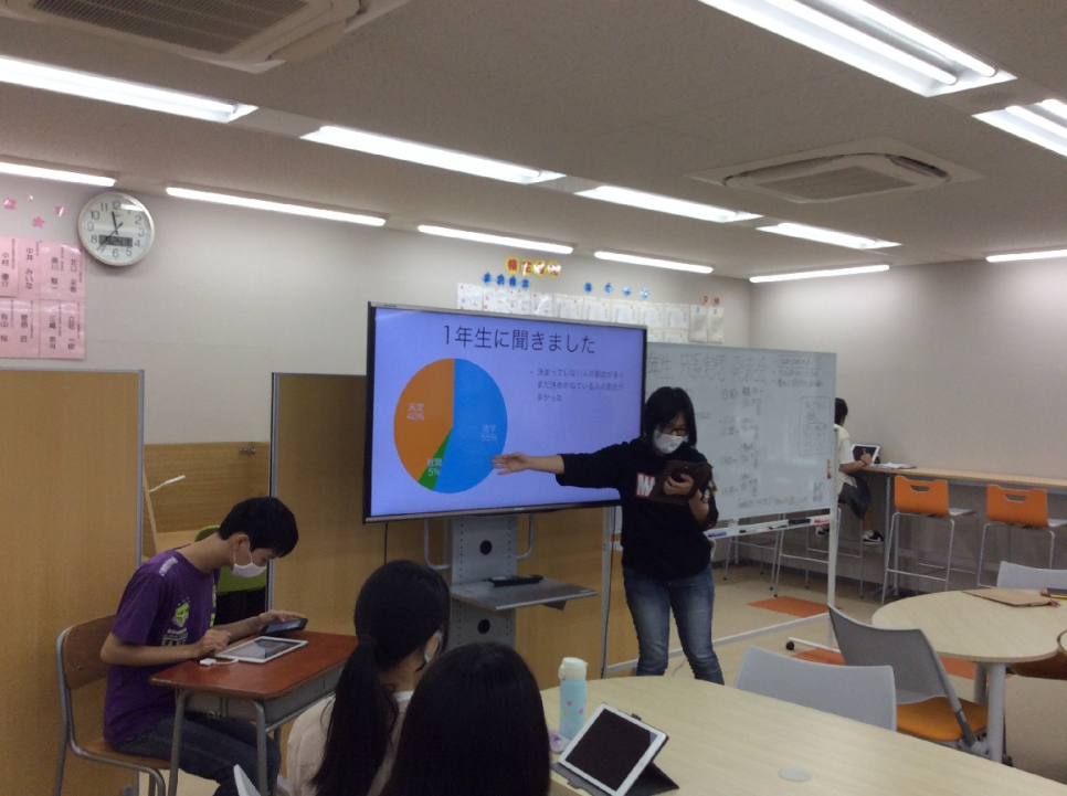 「今日2年生の発表を聞いて次は自分の番だとより一層気を引き締まりました。2年生の調べた発表を見て細かい所やグラフを使っていて発表も慣れたように発表されてたので先輩方を見習って行きたいと思います」