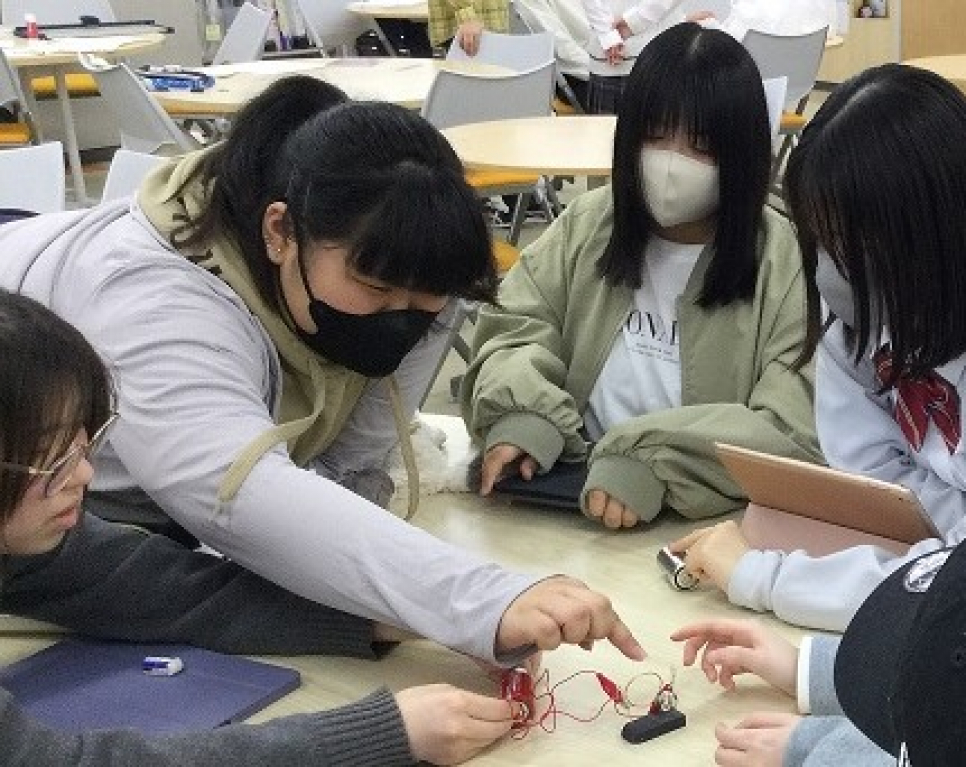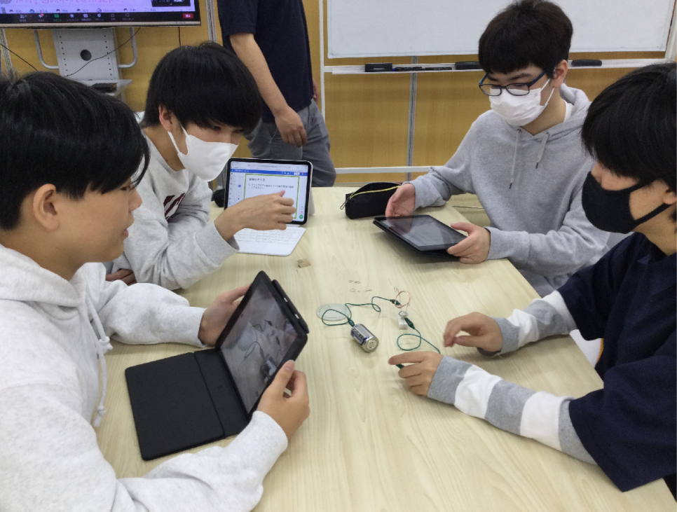 実験では、各グループで協力してワイワイ言いながら、取り組んでいます。