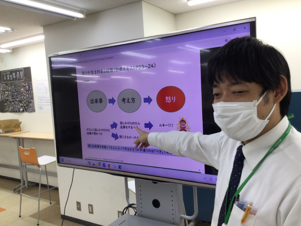 先日、アンガーマネジメント検定の対策講座を実施しました。 アンガーマネジメント検定とは、怒りの問題解決のために必要なアンガーマネジメントの知識・技術を学ぶ検定試験です。 検定試験当日が迫ってきた今回の対策講座では、 「怒り」ってなんだろう?という問いや、気持ちを落ち着かせるヒントについて、グループワークをしながら学びを深めていきました。 受講した生徒からは「怒っている人がどんな気持ちなのかを知れたことが良かった 」「 怒ることのデメリットの側面しか知らなかったから怒ることは悪いことだというイメージがあったけれど、怒りについてよく知るとメリットもあった 」などの感想がありました。 検定対策だけでなく、日常生活にも活かせる学び・気づきが多くある、良い時間になりました。 みなさん、合格に向けて残りの期間も頑張りましょう!