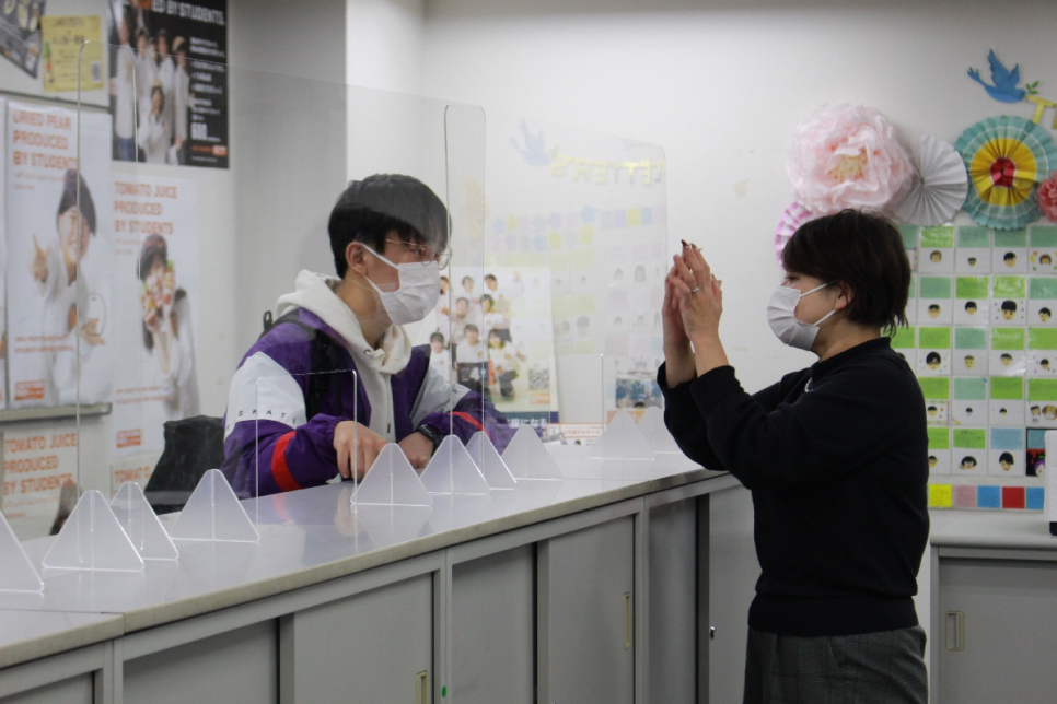 パーテンション越しにしか話せないのは残念ですがこれも生徒のみんなの健康を守るため…我慢!