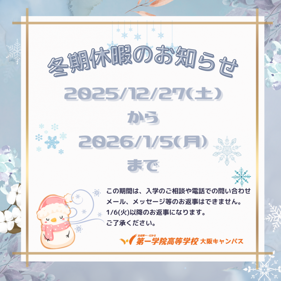 大阪キャンパスの冬期休暇のお知らせです!大阪キャンパスは、2025年12月27日(土)~2026年1月5日(月)まで休校となります。この期間は、電話でのお問い合わせ、メール、メッセージの返信はできません。1/6(火)以降のお返事になります。ご迷惑をおかけしますが、よろしくお願いいたします。