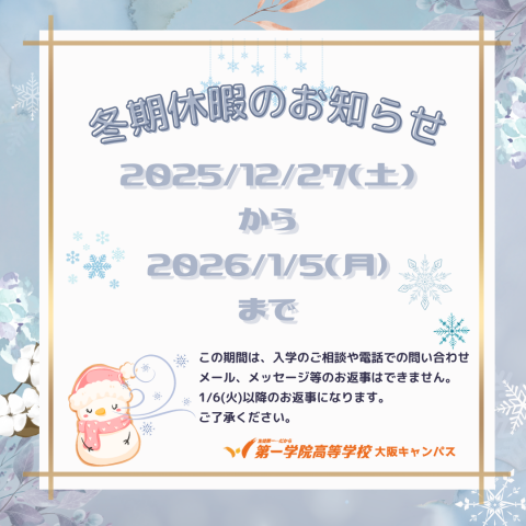 ~冬期休暇のお知らせ~大阪キャンパスの冬期休暇のお知らせです!大阪キャンパスは、2025年12月27日(土)~2026年1月5日(月)まで休校となります。この期間は、電話でのお問い合わせ、メール、メッセージの返信はできません。1/6(火)以降のお返事になります。ご迷惑をおかけしますが、... -