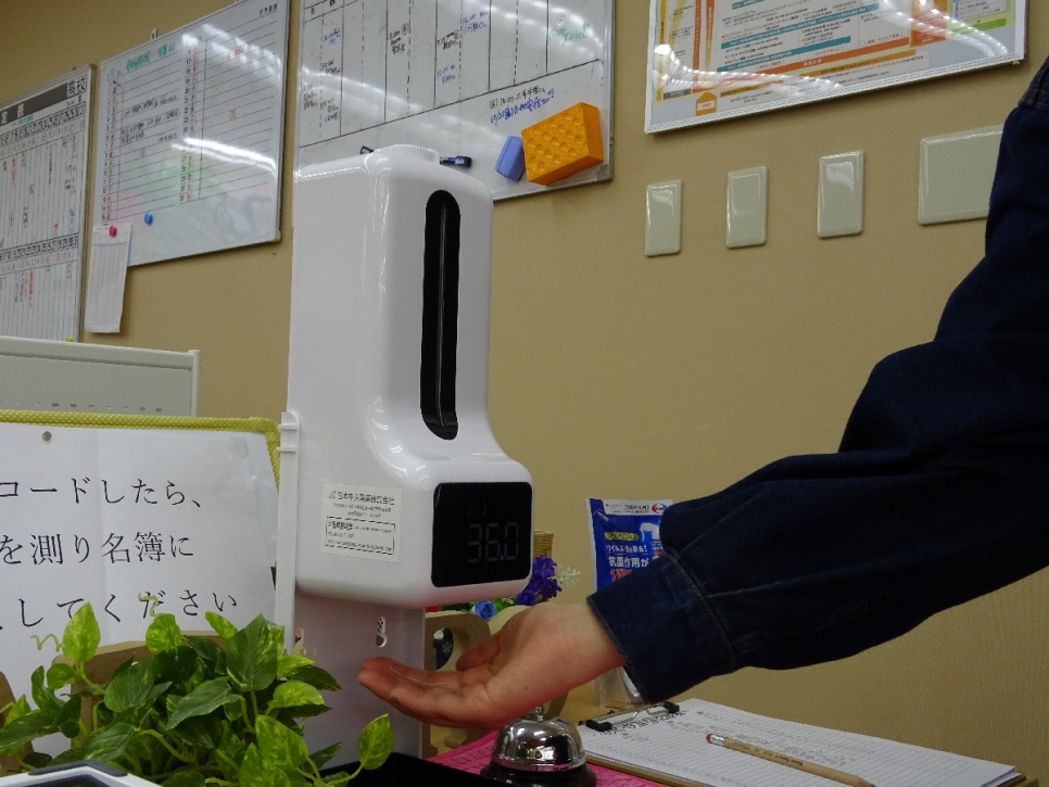 この度、体温計と消毒が一気にできる機械が導入されました。