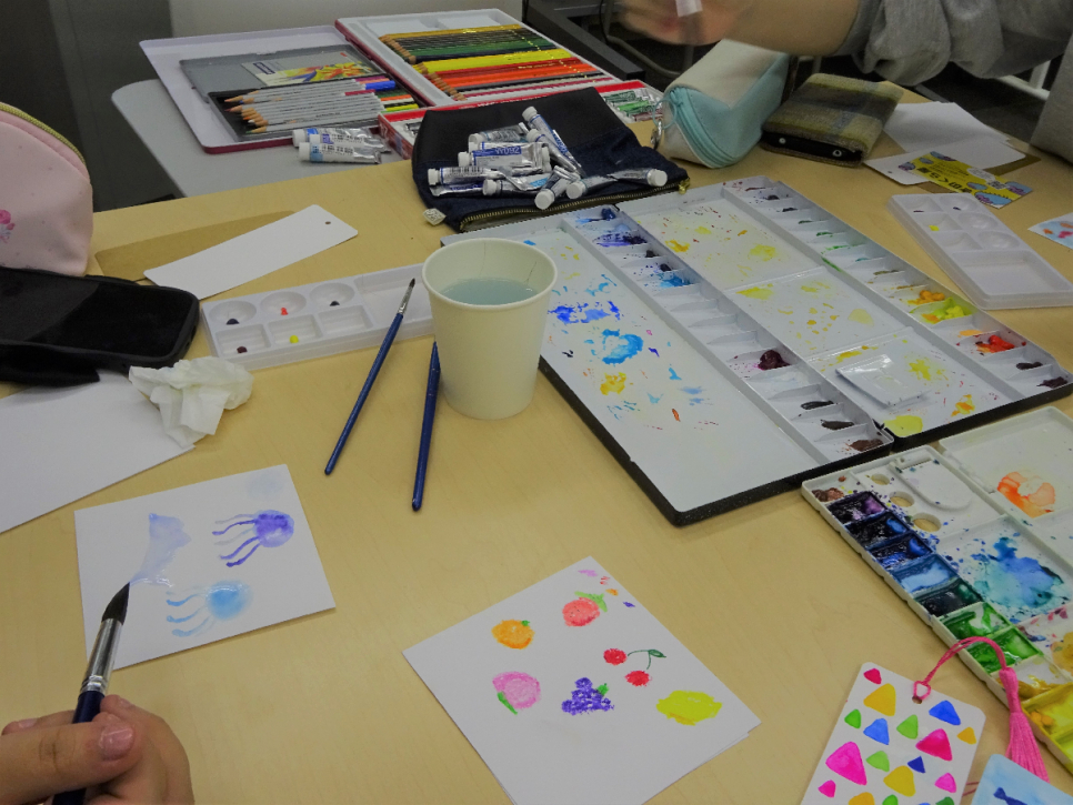 アクリル絵の具や水彩色鉛筆、透明クレヨンなど様々な画材をつかい