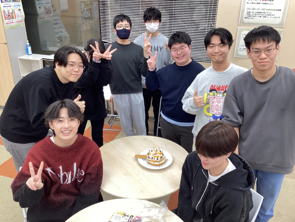 今回は、12月24日に開催された クリスマスレク の様子を紹介します! クリスマスレクでは2つのチームに分かれてケーキ作りを行いました。スポンジにホイップクリームを塗ったり、お菓子やフルーツをデコレーションしたりして楽しみましたよ。自分たちで作ったので、いつも以上に美味しかったようです。 今後もレクのお知らせをお楽しみに!!